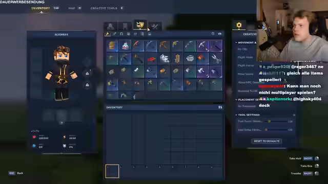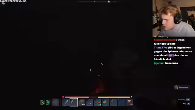 01:44:38Die Erkundung wird gefährlicher. Ein unübersichtliches, düsteres Gebiet mit unsichtbaren Wänden und vielen Feinden stellt den Streamer vor Herausforderungen. Er kämpft gegen Skelette und bemerkt, dass die Gegner relativ viele Leben haben. Ein besonderes Unbehagen verursachen Spinnen, für die es sogar einen Arachnophobie-Modus gibt. Nach einem Ausflug in eine dunkle Höhle muss er feststellen, dass die Sichtbarkeit sehr begrenzt ist. Der Umgang mit der neuen Waffe, dem Bogen, wird geübt, auch wenn die Physik der Pfeile anfangs verwirrt.