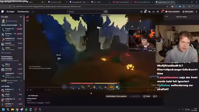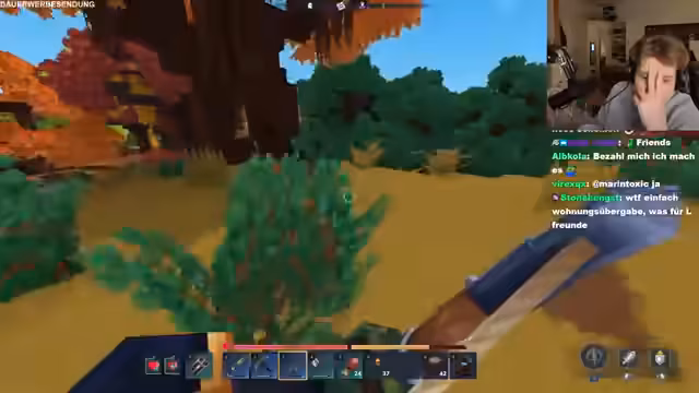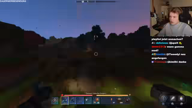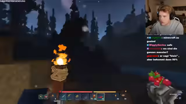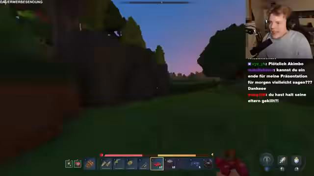 09:21:21Nach dem Betreten der Dimension wird ein riesiger Baum entdeckt. Der Streamer sucht nach Rittersport und anderen Gegenständen. Die Gruppe diskutiert über die Zeitbegrenzung und die Notwendigkeit, Items zu sammeln. Es wird klar, dass die Dimension voller versteckter Kisten und Ressourcen ist, die sie nicht in der Overworld finden können. Die Dimension ist zufällig, aber sie haben sie gezielt gezielt.