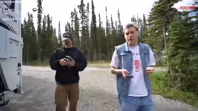 11:45:08Die Streamer wechseln die Stimmung, als sie sich der Goldsuche nähern. Sie sprechen von der harten und schmutzigen Arbeit, die bevorsteht, und betonen den Kontrast zum bisherigen Sightseeing. Am Ufer eines Sees machen sie eine Pause, beschreiben die Spiegelung der Landschaft im Wasser und werfen Steine hinein. Es werden Pläne für den nächsten Tag besprochen, eine Grenzüberquerung nach Alaska und das Finden eines Campingplatzes.