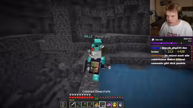 03:13:44Das Team beschließt, tiefer in eine Mine vorzudringen, um Diamanten zu farmen. Es wird die Strategie erörtert, Schulkisten herzustellen, um die gesamte Ausrüstung mobil und sicher transportieren zu können. Der Streamer stößt auf eine reiche Diamantader und sammelt insgesamt 19 Diamanten. Gleichzeitig wird die gefährliche Situation durch plötzliche Angriffe von Mobs, wie einen Zombie mit Bogen, beschrieben, was die hohe Intensität des Spiels verdeutlicht.