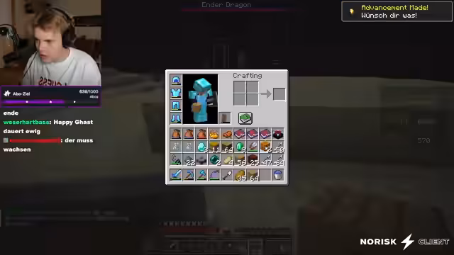 05:43:40Nach dem Erreichen des Endes beginnt das Team mit der Erkundung einer Dungeons, um Ressourcen wie Bücherregale und Infested Stones für das Eye Armor Template zu farmen. Ein Netheritenugget wird gefunden, was ein wichtiger Schreitt für den Aufstieg der Ausrüstung ist. Es werden Endkristalle mit einer Eisenschaufel abgebaut und Goldnuggets in einen Endbrunnen geworfen, um Achievements freizuschalten. Das Team erledigt den Enderdrachen und platziert einen Happy Ghast, um weitere Punkte zu sammeln.