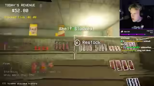 04:10:37Der Streamer wird von einem Bastard erschreckt und liest Anweisungen auf dem Checkout-Counter vor. Er schließt seinen Puls an und startet die Session. Er erklärt das Customer Integration Protocol und wie man Doppelgänger identifiziert und erschießt. Er hat einen hohen Puls und muss die Instructions lesen. Er restockt Regale und wird von einem Kunden unterbrochen. Er scannt die ID des Kunden Clyde Dawson und befragt ihn nach seinen Klamotten. Er baggt Items und unlocked die Gun. Er schießt versehentlich auf seinen Freund. Er scannt Bonnie McCree und befragt sie zu ihrem Job als Krankenschwester und ihrem Körper. Er diskutiert, ob er sie erschießen soll, weil sie keine Brille trägt. Er scannt Nathan Calloway und stellt fest, dass er deceased ist. Er entsorgt Müll und wird von einem zerfledderten Körper überrascht. Er wischt und fragt nach der Bedeutung der Ausbruchzeichen. Er scannt Julietta Granger und stellt fest, dass sie eigentlich ein Klempner sein sollte. Er lässt eine Lieferung rein und befürchtet ein Trojanisches Pferd. Er wird von einem Anruf erschreckt und erschießt jemanden. Er nimmt die Waffe mit und platziert Bärenfallen und Verbarrikadierungen. Er füllt Regale nach und wird von Backseat-Gaming genervt. Er scannt Kevin Larsen und checkt die Anomalien ab. Er diskutiert, was passiert, wenn man einen Alien durchlässt. Er liebt Bus fahren und freut sich über den Erfolg im Spiel. Er hasst das Noticeboard und liest über einen abgebrannten Laden.