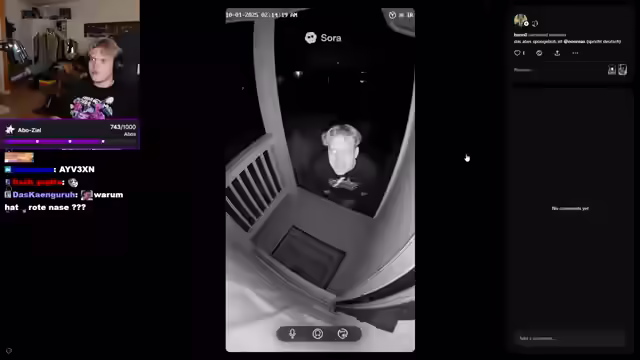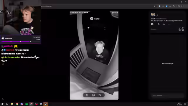 00:59:03Es wird überlegt, wie man Placements in den Stream einbauen könnte, um Content zu liefern und überall dort präsent zu sein, wo der Hype stattfindet. Die Illuminaten haben zusammen mit Adolf Hitler eine Raumstation im Mond gebaut, weshalb dieser so perfekt rund sei. Der Streamer imitiert Adolf Hitler. Es wird darum gebeten, weniger Hitler-Bezüge zu verwenden. In Miami und Kanada kann die App immer noch nicht heruntergeladen werden. Man solle einen VPN nach Amerika nutzen und sich bei Sora anmelden. Es wird vermutet, dass Basti etwas verheimlicht, da er immer verschwindet, wenn etwas Spannendes passiert. Er wurde nachts in schwarzer Kleidung mit einer verdächtigen Tasche aus der Garage gesehen.