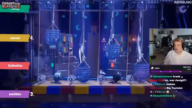 04:52:31Der Stream beginnt mit einer dynamischen Sequenz eines actionreichen Mini-Games. Der Streamer beschreibt seinen turbulenten Start, eine schnelle Niederlage und den anschließenden Versuch, zurückzukehren. Er vergleicht seine Leistung mit den Mitspielern, berichtet über hohe Punktzahlen und strategische Entscheidungen wie das Anbringen von Schaden an den Mitspielern. Die Spiele sind geprägt von hoher Geschwindigkeit, unerwarteten Plätzen und viel Gerangel, wobei er seine Positionen ständig überprüft und sich über unfaire Blockaden beschwert.