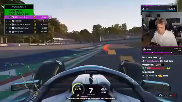 01:54:36Der Streamer erreicht mit einer provokanten First Message eine starke Position in der Qualifikation. Während des Rennens kämpft er um Platzierungen und macht sich über seine Konkurrenten lustig. Er berichtet über technische Schwierigkeiten, wie zum Beispiel den Verlust von Reifenhaftung und Lenkradprobleme, die seine Performance beeinflussen. Trotzdem schafft er es, eine gute Rundenzeit zu erzielen und sich im Mittelfeld zu etablieren, auch wenn er unzufrieden mit seiner allgemeinen Leistung ist.