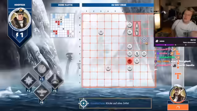 06:11:07Das Spiel Schiffe versenken eskaliert zu einer taktischen Schlacht. Beide Spieler versuchen mit intelligenten Zügen und Mustern die Flotte des Gegners zu finden. Der Streamer zweifelt an seinen eigenen Entscheidungen und denen seines Gegners, beschreibt aber auch Momente des Glücks. Es kommt zu Verwirrung über Schiffstypen, ihre Formen und die Funktionsweise der Spezialfähigkeiten, was zu unterhaltsamen Missverständnissen führt.