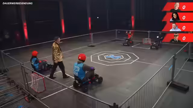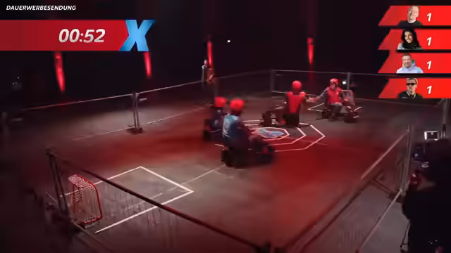 02:51:02Nach der regulären Spielzeit geht das Spiel in eine Verlängerung. Die Seiten werden gewechselt, die Spieler erhalten eine Minute für neue Taktiken. Das Spiel ist von intensiven Ballkämpfen und Zeitstrafen geprägt. Team Rot setzt sich am Ende durch und gewinnt mit 6 zu 3. Nach dem Spiel werden die Spieler von der Produktion gelobt, die Karts sind jedoch stark beschädigt, was für humoristische Momente sorgt.