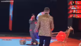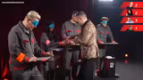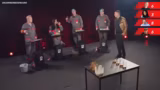 00:59:44Für die nächste Spielrunde verlassen die Spieler ihre Pulte. Das Spiel besteht darin, dass sich die Spieler Hühner unter ihre Füße binden müssen. Die Hühner sind mit Gaffa-Tape an den Schuhen befestigt und müssen so bewegt werden, dass sie bei jeder Bewegung quietschen. Ziel ist es, mit den quietschenden Hühnern eine bestimmte Distanz zu überwinden, was eine zusätzliche, humorvolle Herausforderung darstellt.