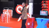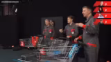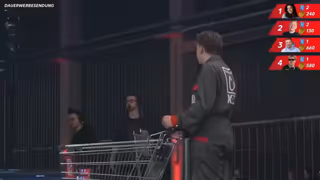 04:18:08Nach dem Radspiel beginnt ein neues Spiel, das an Curling erinnert, bei dem die Spieler stattdessen mit Einkaufswagen um die Wette schieben. Jedes Team erhält einen Einkaufswagen, die Teamfarbe wird durch ein Leibchen im Wagen markiert. Die Teams werden eingeteilt und stehen in Reihen nebeneinander. Die Spielregeln werden erklärt: Jedes Team hat insgesamt drei Versuche, um seinen Wagen so nah wie möglich an eine Ziellinie zu schieben. Ein Probestoß soll den Spielern ein Gefühl für den Wagen vermitteln.