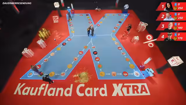 04:07:44Nach einer fünfminütigen Pause wird der Stream mit einer Kaufland-Werbung fortgesetzt. Der Gewinner der PlayStation 5 wird bekannt gegeben. Anschließend beginnt ein neues Spielrunde mit einem Glücksrad. Die Spieler würfeln, um sich auf dem Feld zu bewegen und Treuepunkte zu sammeln oder Special-Felder wie 'X' zu erreichen. Der Streamer nutzt einen 'Prozentgutschein', um den Preis eines 'X'-Feldes zu halbieren. Es kommt zu einem Duell zwischen zwei Spielern, bei dem einer der beiden zwei Felder zurücksetzen muss, da sie auf demselben Feld gelandet sind.
