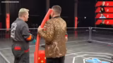02:41:46Nach dem Ausfall des Karts wird eine neue Regel von 'Herr Kaufland' eingeführt: Tore dürfen nur aus der eigenen Spielfeldhälfte erzielt werden. Dies soll zusätzliche Spannung ins Spiel bringen. Beim Wiedereinstieg gibt es weitere Verwirrungen über die genauen Spielabläufe und Positionen. Auch das Helmgesicht der Teilnehmer wird kurz bewertet, bevor das Spiel mit der neuen Regelung und einer verbleibenden Spielzeit von 3 Minuten fortgesetzt wird.