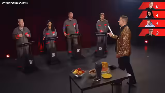 01:48:18Das Programm wechselt zu einer Quizrunde. Die Teilnehmer müssen ohne Hilfsmittel den Inhalt verschiedener Schalen schätzen. In der ersten Aufgabe gilt es, das Gewicht einer Melonenscheibe in Gramm zu erraten. Die richtige Antwort liegt bei über 1000 Gramm. In der zweiten Aufgabe müssen die Teilnehmer die Anzahl der Blaubeeren in einem Stiefel schätzen. Diese Runde fordert das räumliche Vorstellungsvermögen und die Fähigkeit, unter Zeitdruck zu raten.