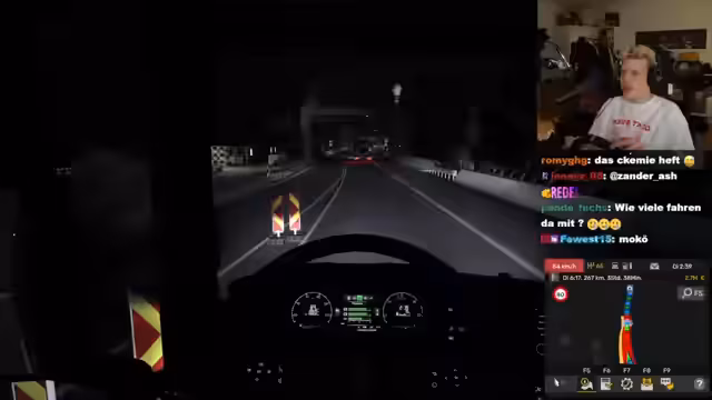 01:21:00Der Stream wechselt zum Euro Truck Simulator 2. Nach einem technischen Hiatus werden die Einstellungen für eine Truck-Spedition geprüft. Geplant ist ein gemeinsames Fahren mit einem eigenen Firmen-Design. AlsHighlight wird ein Song-Request-System aktiviert, bei dem Zuschauer für 10.000 Kanalpunkte Lieder anfordern können. Dies führt zu einer eingängigen Playlist, die das Trucking begleitet. Der Streamer bewundert die Grafik und das Geschehen im Spiel, besonders in großen Konvois.