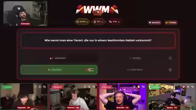 02:44:34Der Stream beginnt mit einer Quizfrage, bei der es um die Erkennung eines Planeten geht. Es folgt eine weitere Frage, bei der die Anzahl der Minuten in zwei Tagen berechnet werden soll, aber die Teilnehmenden haben keine Lust, die Aufgabe auszurechnen. Es folgen weitere Quizfragen, darunter eine Frage zur Bedeutung von USB, bei der geraten wird. Eine weitere Frage dreht sich um ein Synonym für 'opulent', welche richtig beantwortet wird. Später geht es um die Frage, wie man eine Tierart nennt, die nur in einem bestimmten Gebiet vorkommt. Die Stimmung ist locker und humorvoll, begleitet von Kommentaren und Späßen zwischen den Teilnehmenden. Es wird überlegt, ob eine Firma genannt werden darf, und es gibt Überlegungen zu den Antworten. Es wird eine Frage zu Tränengas gestellt, bei der ein Joker eingesetzt wird, obwohl die Antwort bekannt ist. Die Teilnehmenden diskutieren über die Schärfe verschiedener Gase und überlegen, ob sie nach dem Quiz ein anderes Horror-Spiel spielen sollen.