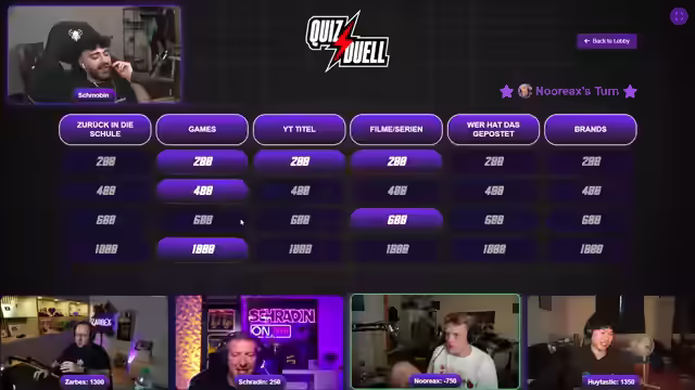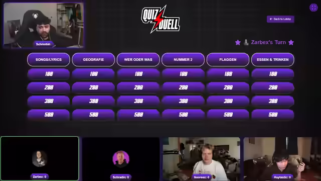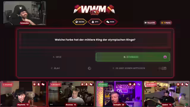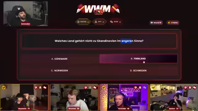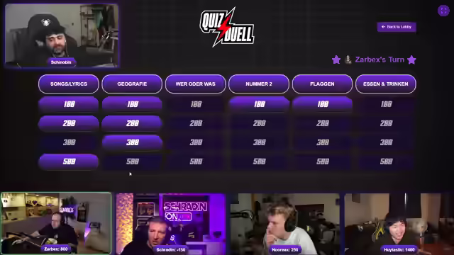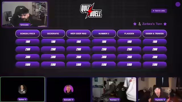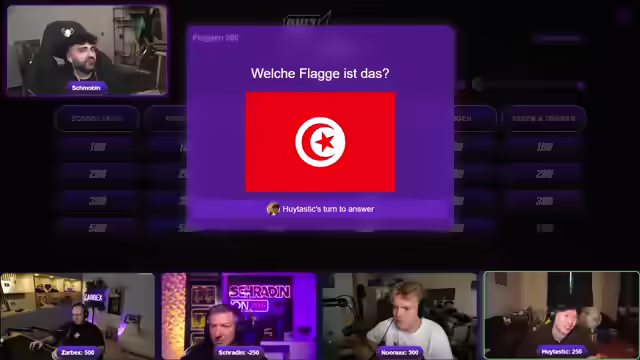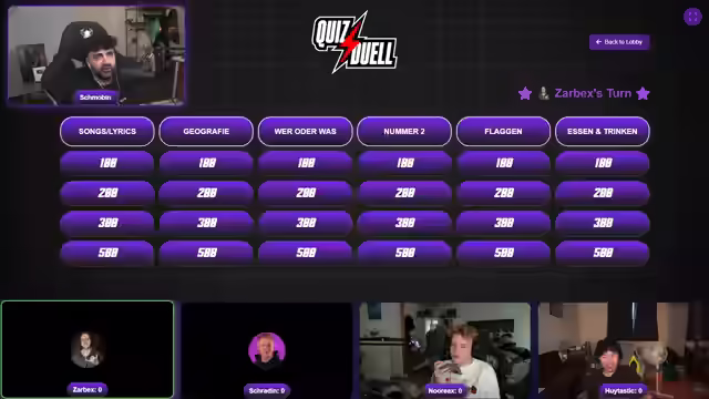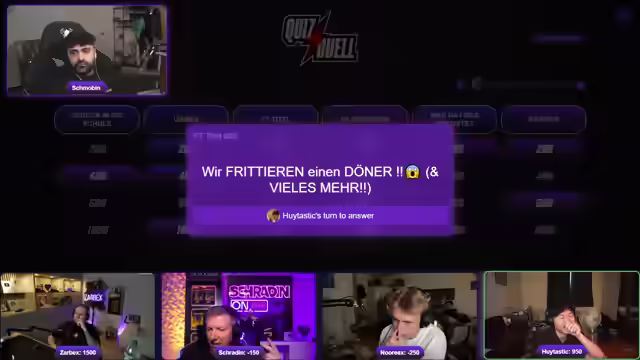 00:44:09Es wird festgestellt, dass der Ton nicht synchron zum Bild ist. Der Spielablauf wird erklärt: Swiss-Duell, bei dem die Teilnehmer nacheinander eine Kategorie und Punktzahl auswählen. Höhere Punktzahlen bedeuten schwerere Fragen. Bei falscher Antwort werden Punkte abgezogen und die anderen können buzzern. Der Buzzer wird unter der Frage eingeblendet. Zabex darf anfangen, und Schradin darf sofort buzzern, wenn er etwas weiß. Es wird kurz über Gönnergy-Werbung und Emotes only im Chat gesprochen. Zabex wählt die Kategorie Essen und Trinken für 500 Punkte und wird gefragt, welches Gewürz aus den getrockneten Narben der Blüte einer Pflanze besteht. Schradin wird ermahnt, nicht in den Chat zu schauen. Zabex rät Safran und liegt richtig. Schradin darf nun eine Kategorie aussuchen.