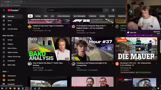 05:27:44Der Streamer äußert den Wunsch, die Community stärker in den Content einzubinden, beispielsweise durch die Präsentation von Zuschauer-Schulpräsentationen. Er bedauert, dass bisher zu wenige Leute bei solchen Aktionen mitmachen und schlägt vor, den Discord-Server aktiver zu gestalten. Als Plan wird gefasst, den Schlafrhythmus umzukehren, die Nacht durchzumachen, am Morgen zu streamen und den ganzen Tag wach zu bleiben, um den Stream aufrechtzuerhalten. Es wird auch überlegt, eine Watchparty für die Formel 1 zu veranstalten, was jedoch aufgrund von Streaming-Rechten schwierig ist, da der Streamer die F1 zwar sehen kann, die Zuschauer aber nicht, da kaum jemand die teure F1-Option abonniert hat.