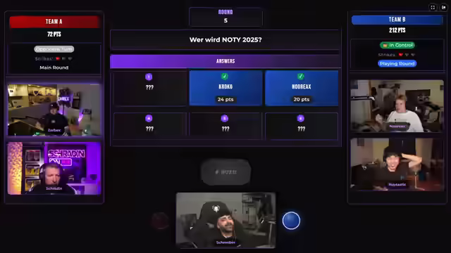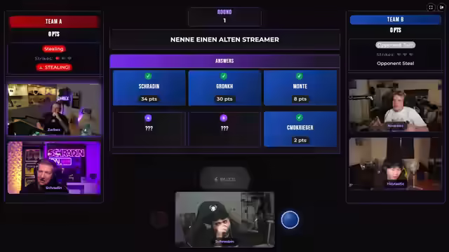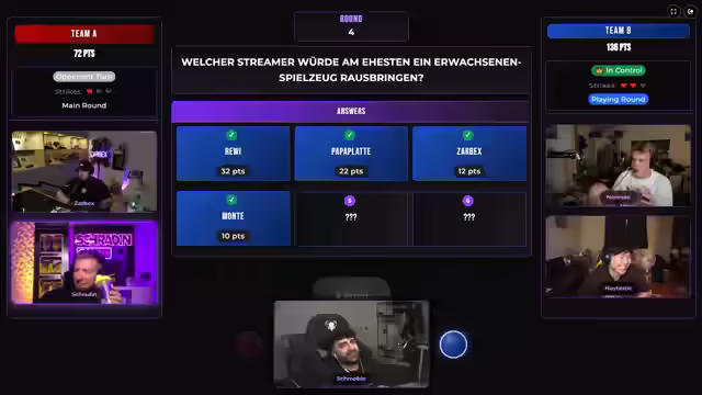 01:30:53Das 'Chat-Duell' beginnt mit der ersten Runde, in der Zabex und Noreax gegeneinander antreten. Die erste Frage lautet: 'Nenne einen alten Streamer'. Noreax antwortet mit Schradin, der auf Platz 1 mit 34% liegt. Noreax ist weiterhin an der Reihe und nennt Monte, der auf Platz 3 mit 8% liegt. Es wird diskutiert, wer noch ein 'Ank' ist. Noreax nennt Knossi, der jedoch nicht dabei ist. Er nennt Gronkh, der auf Platz 2 mit 30% liegt. Es wird überlegt, ob Elotrix oder CommanderKrieger genannt werden sollen. Noreax entscheidet sich für CommanderKrieger, der auf Platz 6 mit 2% liegt. Es wird überlegt, ob Gölz oder Rocket Beans genannt werden sollen. Schradin wird um Rat gefragt. Zabex und Schradin dürfen sich nun besprechen und mit einem Call alles klauen. Es wird überlegt, ob Trimax genannt werden soll. Schradin kennt niemanden anders als Trimax. Trimax ist leider falsch. Papa Platte wäre die richtige Antwort gewesen.