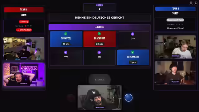 01:35:57Die nächste Runde im Chat-Duell startet mit der Frage: Nenne ein deutsches Gericht. Schradin antwortet mit Bratwurst, was auf Platz 2 liegt. Hui ist nun an der Reihe und muss die Top-Antwort finden. Er überlegt und sagt dann: Schnitzel, was tatsächlich auf Platz 1 ist. Hui ist weiterhin an der Reihe. Er überlegt und sagt dann Kartoffeln, was jedoch nicht dabei ist. Noreax ist nun an der Reihe. Es wird überlegt, was typisch bayerisch ist und was die Leute wohl geantwortet haben. Kohlrouladen, Sauerkraut und Kartoffelsalat werden diskutiert. Sauerkraut ist auf Platz 6 mit 7%. Kartoffelsalat ist nicht dabei. Schradin und Zabex dürfen sich nun beraten und die verbleibenden Antworten erraten. Es wird überlegt, ob Rouladen generell gelten oder ob man spezifisch sein muss. Schweinebraten wird als typisch deutsches Gericht genannt. Königsberger Klopse, Gulasch und Braten werden ebenfalls in Betracht gezogen. Sie entscheiden sich für Braten, was jedoch falsch ist. Currywurst, Döner und Maultaschen wären noch richtig gewesen.