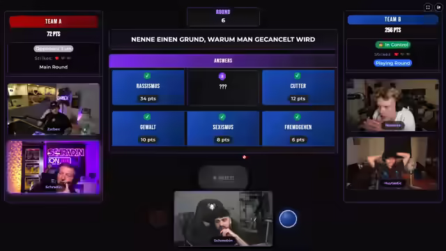 01:57:02Die nächste Runde des Quiz dreht sich um Gründe für einen Cancel. Schradin verliert gegen Hui, weil er Politik als Antwort nennt, was nicht korrekt ist. Die richtige Antwort wäre Rassismus gewesen. Es wird überlegt, welche anderen Gründe für einen Cancel in Frage kommen, wie Fremdgehen oder das Wohnen auf Madeira. Der Streamer hat Schwierigkeiten, passende Oberbegriffe zu finden und schlägt scherzhaft "Tiere verprügeln" vor. Gewalt wird als Antwort genannt und erreicht 10%. Weitere Vorschläge wie Fortnite und Sexismus werden diskutiert, wobei Sexismus auf Platz 5 landet. Es wird überlegt, ob Belästigung unter Sexismus fällt und ob Rassismus weitere Unterkategorien umfasst. Die Diskussion dreht sich um die Frage, ob Mord ein möglicher Grund für einen Cancel wäre, insbesondere im Hinblick auf aktuelle Ereignisse mit einem Musiker. Casino wird als verpasste Chance bedauert, da es eine gute Antwort gewesen wäre. Am Ende wird Homophobie in den Raum geworfen, aber nicht oft genug genannt. Die Runde endet mit der Feststellung, dass die Hauptrunde abgeschlossen ist und das Finale bevorsteht.