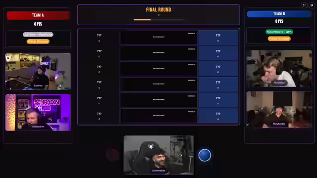 02:01:48Die Teams wählen Schradin für das Finale aus. Das Finale besteht aus sechs Fragen, die innerhalb von 30 Sekunden beantwortet werden müssen. Zerbex muss Schradin muten, damit er die Fragen nicht hört. Norex bekommt 30 Sekunden Zeit für die Fragen und erhält bei Stottern zusätzliche Zeit. Die Fragen umfassen das Packen eines Schulrucksacks, das Vergessen von Gegenständen, eine Biersorte und ein Twitch-Emote. Norex beendet die Runde ohne großen Erfolg. Schradin erhält fünf Sekunden mehr Zeit und muss andere Antworten als Norex geben. Die Fragen werden wiederholt, und Schradin gibt alternative Antworten. Es stellt sich heraus, dass einige Antworten von Norex sehr speziell waren, wie z.B. die Biersorte Berliner Kindle. Smiley wird als Twitch-Emote genannt, was diskutiert wird. Es wird geklärt, ob nach einer Biermarke oder einer Biersorte gefragt wurde. Die Antworten werden eingetragen, und es wird festgestellt, dass vieles vor dem Bier passiert ist. Zabex kündigt an, am Sonntag einen zwölf Stunden Stream zu machen, und es wird über zukünftige Tourpläne gesprochen. Die Mutter von Robin soll von Zabex gegrüßt werden, was dieser auch macht. Es wird festgestellt, dass die ersten Fragen gut waren, aber der Rest eher zufällig. Die Auflösung der Fragen ergibt, dass Schradin und Zabex gewonnen haben.