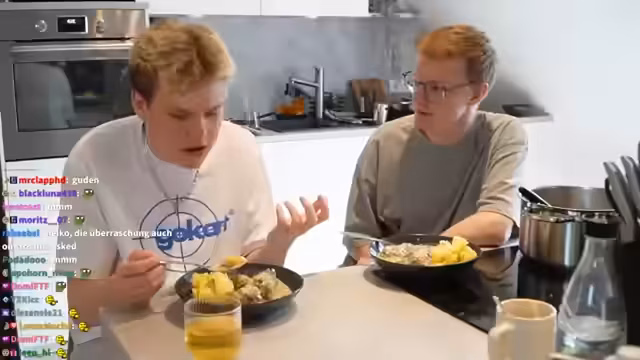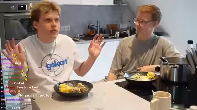 00:42:01Als Beilage zu den Klopsen werden Pellkartoffeln zubereitet. Hierbei werden skurrile und humorvolle Methoden ausprobiert, wie das Schälen mit einem Kartoffelschäler und ein experimenteller Versuch mit Rasierklingen in einem Glas, was als gescheitert gilt. Ein weiteres Highlight ist das Vorlesen einer Fanfiction über den Streamer im Stil von Autobahn-Rennen, was die Zuschauer sehr amüsiert und das Themenspiel erweitert.