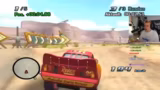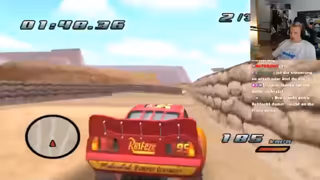 03:00:00Das Gameplay dreht sich um ein Rennen als Lightning McQueen, bei dem der Streamer gegen computergesteuerte Gegner antritt. Er hat Schwierigkeiten mit der Steuerung, speziell mit dem Bremsen und Driften, und versucht vergeblich, einen Controller anzuschließen. Trotzdem findet er Spaß im Nostalgiefaktor des Spiels. Er interagiert mit der Spielwelt und sammelt Gegenstände wie Reifen, während er gleichzeitig das ungewöhnliche und manchmal laute Sounddesign des Spiels kritisiert.
