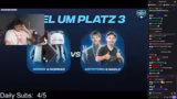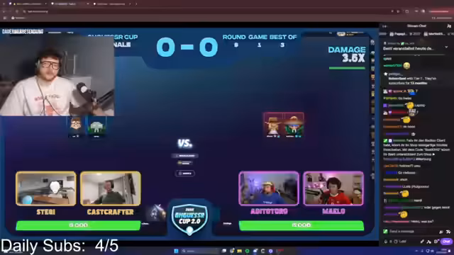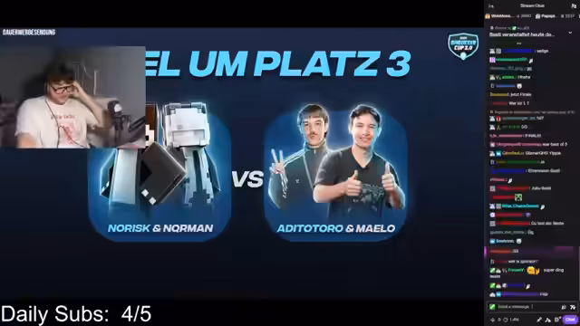 04:32:26Das Stream-Setup konzentriert sich nun auf das Finale und das Spiel um Platz 3. Die Halbfinale sind vorbei; Merle und Koko gegen Vito sowie Adi und Meilo gegen Stegi und Classcraft. Adi und Meilo spielen um Platz 3 und Merle und Koko im Finale. Streamer Hugo äußert, dass er Kroko im Finale unterstützen würde, auch wenn sein eigenes Team unterlegen war. Er beschreibt das Turnier als großartig und betont den hohen Anspruch der 10.000€-Wette.
