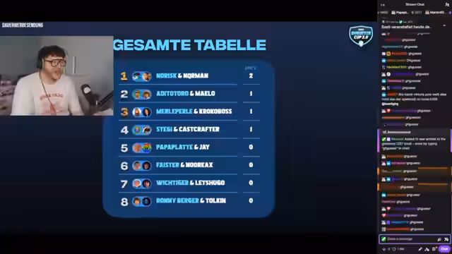03:14:15Die Teilnehmer analysieren die vorherige Runde und kommen überein, dass die Guesses sehr ausgeglichen waren. Der Verlierer des Matches zwischen Koko und Stegi/Heiko wird nun im Halbfinale antreten, während das Spiel um den Gruppensieg für Gruppe B ansteht. Norman und sein Partner Veto diskutieren die Spielstrategie, insbesondere die Meta des No-Move-Vetos, von dem sie glauben, dass es ihnen Vorteile bringt. Die Stimmung ist konzentriert, aber optimistisch für die bevorstehenden Runden.