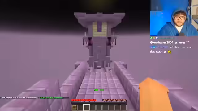 01:50:01Als geplante Taktik mit dem Spawner fehlschlägt, wird eine neue Strategie entwickelt. Man entscheidet, in den Nether zu reisen, um Obsidian zu abbauen und ein Portal zu bauen. Der Streamer stößt auf technische Schwierigkeiten und muss den Modus anpassen. Aufgrund von Bugs und fehlender Funktionalität wird der Stream vorzeitig beendet. Für die Zukunft werden Termine angekündigt, an denen das Battle fortgesetzt wird.