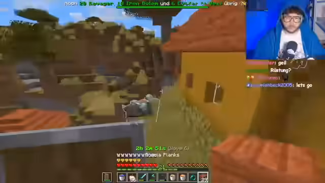 02:43:19Nachdem ein Eisengolem durch die Wave stirbt, konzentriert sich der Streamer darauf, sauber runterzuspielen. Er bemerkt, dass ein Golem nach oben schwimmt und sich Ravager und Eisengolems oben befinden, während keine Evoker mehr vorhanden sind. Er fragt sich, warum er den Drachen gehört hat und stellt fest, dass es Eisengolems gibt. Er verliert seine Lava, sieht sich kurz auf null Herzen, und muss sich nun einem Drachen ohne Bogen stellen. Er plant, den Enderman nicht anzuschauen und den Drachen normal runterzuspielen. Er bedankt sich für Subs und Bits, kann aber aufgrund des Spielgeschehens nicht so stark auf den Chat eingehen. Er analysiert seine Rüstung und die bevorstehende Wave 7. Er überlegt, eine Perle zu nutzen und wird von einem Enderman angegriffen. Er erinnert sich daran, dass er beim letzten Mal an einer Schalker-Enderman-Kombo gescheitert ist und seine Rüstung kaputt gegangen ist. Er überlegt, sich Eisenrüstung zu machen, wenn es komplett kracht.