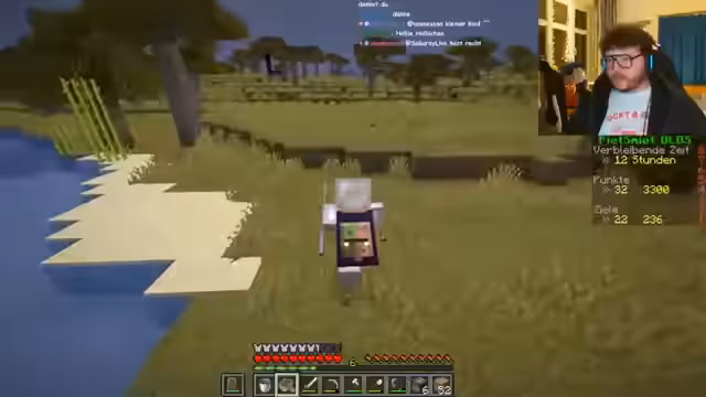 04:13:09Der Streamer sucht nach verschiedenen Materialien im Spiel, darunter Schafe, Wasserflaschen und Sand. Es werden Items ausgetauscht und Inventare sortiert. Der Fokus liegt auf dem Sammeln von Ressourcen wie Holz, Eisen und Netherit-Ziegel. Der Streamer erwähnt auch die Notwendigkeit von Obsidian und das Löschen von Rotten Flesh. Der Chat interagiert währenddessen über die benötigten Items und mögliche Strategien.