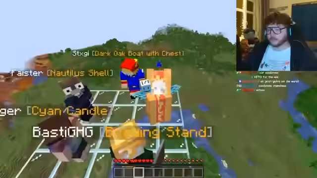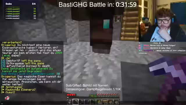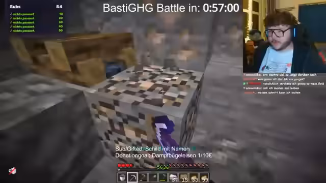 01:35:58Nach längerem Warten beginnt schließlich das Basti-Battle, ein Force-Item-Spiel bei dem alle Teilnehmer unabhängig voneinander versuchen, verschiedene Minecraft-Items zu finden. Es werden Regeln wie PVP-Verbote und das Joker-System erklärt. Der Streamer zeigt Frustration über die technische Umsetzung und die Notwendigkeit, bestimmte Items wie Cut Sandstone oder Glow Lichen zu beschaffen.