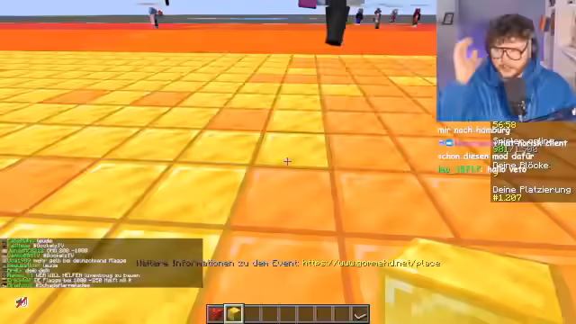 00:08:55Es wird überlegt, ob man die Deutschlandflagge unterstützen soll. Das Event läuft bis zum 20. und geht nachts bis 1 Uhr. Es wird erwähnt, dass es eine Woche läuft. Es wird ein Aufruf gestartet, sofort auf Place.com mitzubauen. Der Streamer fragt nach dem Vorfall in Elements und entschuldigt sich bei Mr. Morgame. Es wird erklärt, dass man das Schematic bei 0-0 machen muss. Es wird ein Kinobesuch des Microsoft-Films erwähnt. Es wird überlegt, den Twitch-Link in den GommeHD.net-Chat zu schicken. Es wird festgestellt, dass man manchmal Blöcke nicht platzieren kann, weil Löcher vorhanden sind. Es wird vermutet, dass dies ein Bug ist.