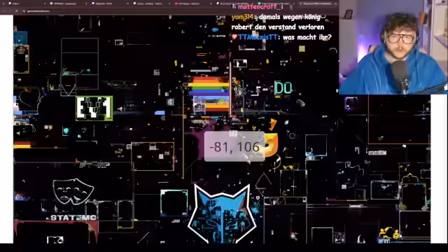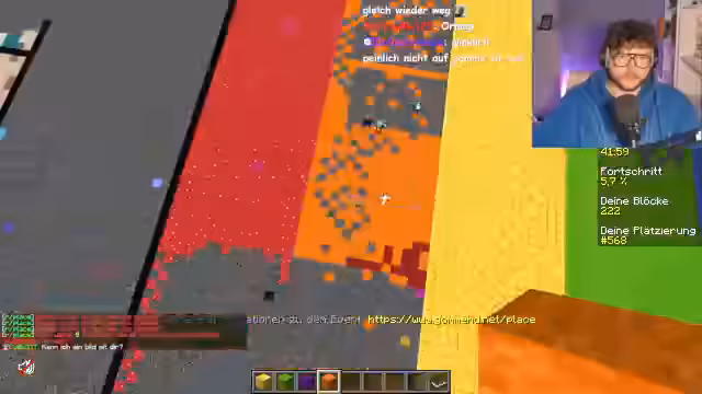00:40:17Es wird vorgeschlagen, sich mehr aufzuteilen, um alle Farben gleichmäßig zu haben. Der Streamer begibt sich zu grün. Es wird bemerkt, dass rot gegrieft wird. TNT und Vodafone AG werden als Übeltäter genannt. Es wird schamlos Werbung gemacht und die Pixel Skills gelobt. Der Streamer erzählt eine gelogene Geschichte über einen Autounfall. Es wird gesagt, dass die Geschichte gelogen ist. Es wird gefragt, was die Vorteile sind, mitzumachen, und geantwortet, dass man dann nicht mehr homophob ist. Es wird erklärt, dass man mit dem Norris-Client einen Döner schneiden kann. Es wird festgestellt, dass grün gut vorangekommen ist und der Streamer nun zu Purple geht. Es wird nach Autoklickern gefragt. Es wird erklärt, dass bei 0,0 das Schematic platziert wird. Es wird die Frage gestellt, warum das gebaut wird, und geantwortet, weil es geil ist und Tradition ist.