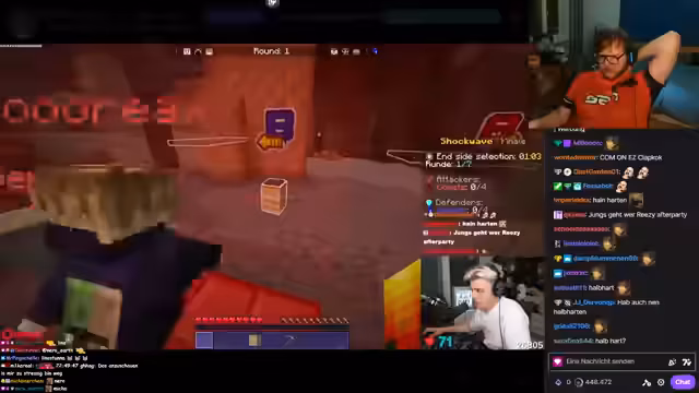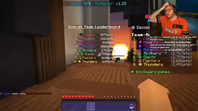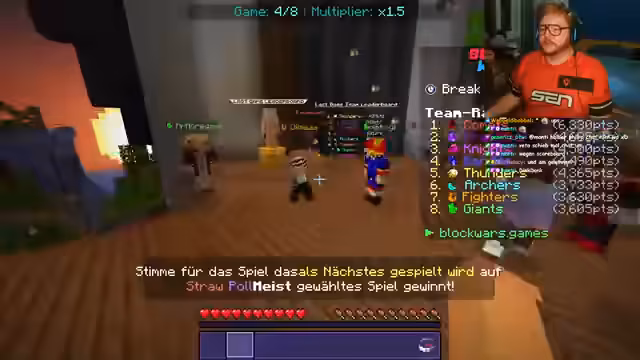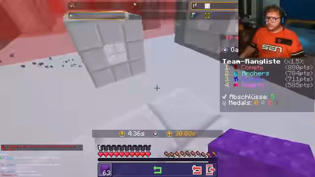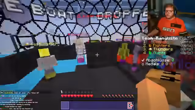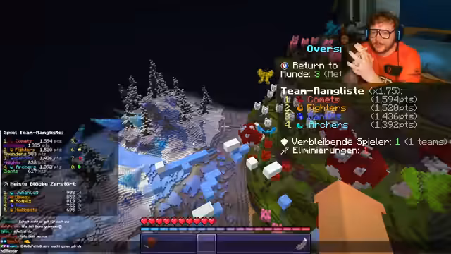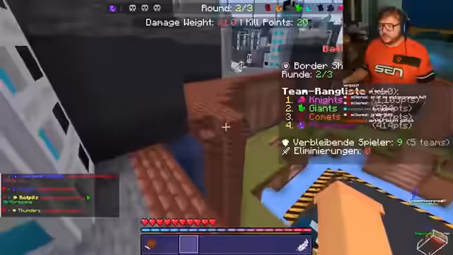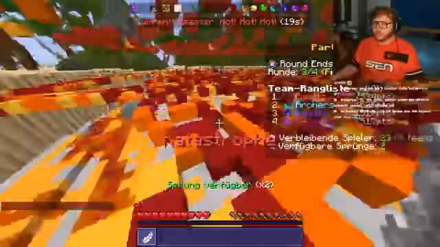 02:55:19Die Spieler bereiten sich auf Overspleef vor, ein Spiel, bei dem man versucht, die Gegner vom Feld zu sprengen, ähnlich wie beim klassischen Spleef, aber mit zusätzlichen Elementen wie TNT und Bögen. Es gibt drei Runden. In der ersten Runde wird der Boden abgebaut, und es gibt Schneebälle zum Wegschlagen. Die zweite Runde beinhaltet Federn zum Salven und Bögen zum Abschießen des Bodens. Es wird diskutiert, ob es einen oder mehrere Layer gibt. In der ersten Overspleef-Runde wird Norman schnell eliminiert, während Papaplatte sich an der Spitze hält. Chefstrobel erreicht den dritten Platz. Rocket Launcher und Bögen mit TNT werden eingesetzt, um sich hochzubefördern oder andere abzuschießen. In einer weiteren Runde wird Norman von mehreren Spielern fokussiert und scheidet aus, während Chefstrobel überlebt. Es wird über Meteoriten gesprochen, die zufällig erscheinen und das Eis zerstören können. Kuba erreicht den zweiten Platz in einer Runde, und das Team wird insgesamt Fünfter. In einer späteren Phase des Turniers liegt das Team auf dem dritten Platz. Hide and Seek beginnt mit der Frage, wo man sich am besten versteckt. Es wird überlegt, ob es klug ist, sich in der Lobby zu verstecken oder in einem der acht Räume um den Hauptraum herum. Die Spieler entscheiden sich, sich nicht aufzuteilen und in verschiedene Richtungen zu gehen. Es wird diskutiert, ob es eine gute Strategie ist, zum Spawn zurückzukehren, um sich dort zu verstecken. Die Spieler haben 14 Sekunden Zeit, sich zu verstecken, bevor die Jäger sie suchen. Die Jäger sind pink und gelb markiert und haben Schwerter. Kuba findet einen guten Spot, während Norman in Lava stirbt. Chefstrobel überlebt und findet einen brutalen Spot. Am Ende der Runde sind die Spieler Dritter. Die Banditen überholen das Team, weil sie alle drei überlebt haben. In der nächsten Runde suchen die Spieler nach neuen Verstecken, da sich die Räume immer ändern. Papaplatte eliminiert Kuba. In einer weiteren Runde verstecken sich die Spieler wieder und versuchen, nicht entdeckt zu werden. Das Team hat am Ende der Runde 200 Punkte Abstand zu den Führenden.