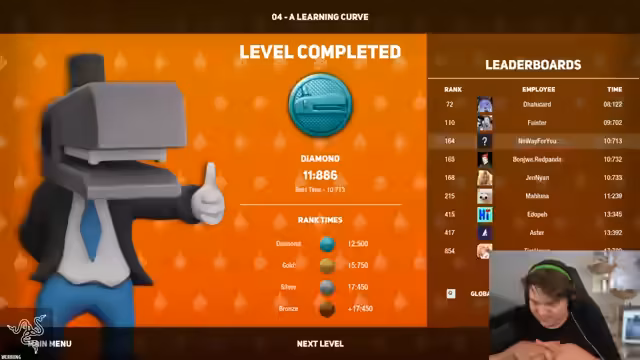 01:02:40Der Stream beginnt mit den Versuchen im Level 5. Teilnehmerinnen und Teilnehmer haben unterschiedliche Ansätze, den Level zu meistern. Ein Gespräch über den richtigen Weg entsteht, bei dem jemand den Ersten anmahnt, aber der Weg unklar bleibt. Ein Hinweis, dass man Treppen skippen sollte, wird gegeben, doch der Mechanismus ist noch nicht geklärt. Die Suche nach einer flüssigen Bewegung und einem kürzeren Weg ist das zentrale Thema der Anfangsphase dieses Levels. Der Wettbewerb unter den Teilnehmern ist bereits spürbar, da jede Sekunde zählt.