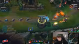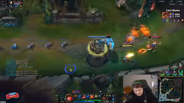 05:11:28Der Streamer spielt gegen hochrangige Gegner, darunter die bekannten Challenger-Spieler Riko und Tunny, die bekannt für ihre Duo-Queue-Kombination sind. Er muss sich in einer schwierigen Lane als Tristana gegen eine starke Yuumi-Kombination behaupten und ist sichtlich frustriert über das aggressiv-spielerische Verhalten des Supports, der ihn im Stich lässt. Das Team insgesamt, insbesondere der Top-Laner, gerät früh in einen erheblichen Rückstand, was den Streamer dazu veranlasst, strategisch zu Split-Pushen, um dem Spiel eine Chance zu geben, despite his tilt.