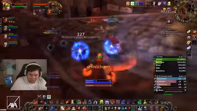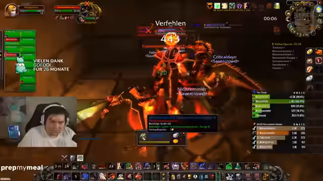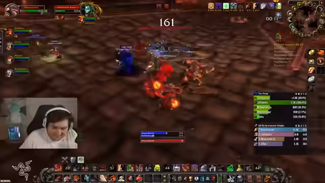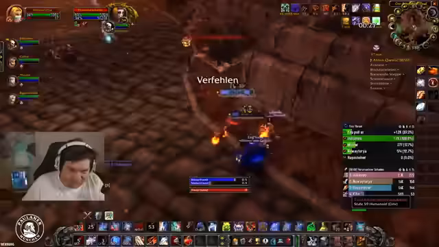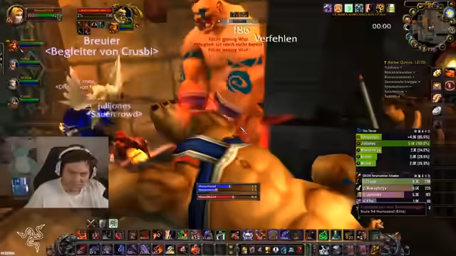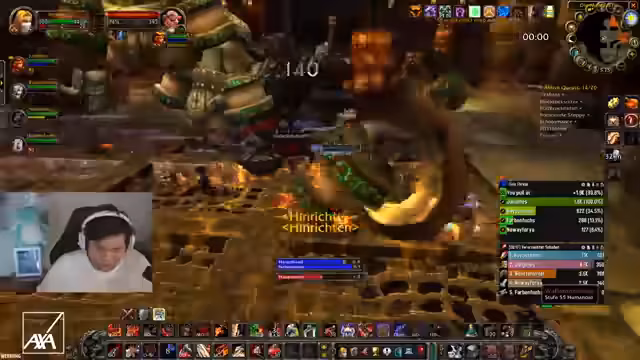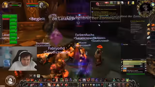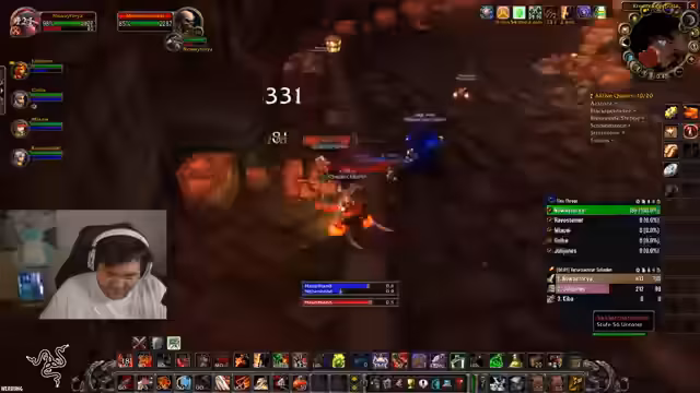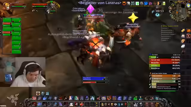 06:28:15Nach einem turbulenten Kampf im Upper Blackrock Spire mit mehreren Todesfällen und geöffneten Eiern, bei dem jedoch alle überlebt haben, geht es mit einer Schlacht gegen einen Boss namens Frank/Johnson weiter. Der Streamer plant, sein erstes Rendschwert zu farmen und droht damit, im Spiel zu köpfen, falls jemand anderes es zuerst erhält. Die Koordination der Gruppe mit Spielern wie Marco und Matthias ist zentral, um die Mobs effektiv zu kontrollieren und die Ziele zu erreichen.