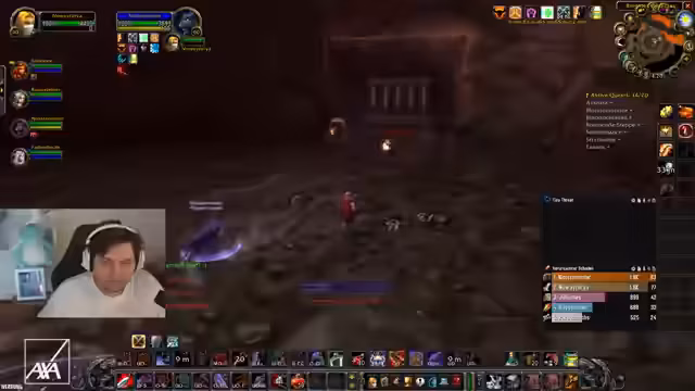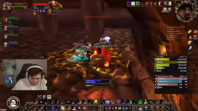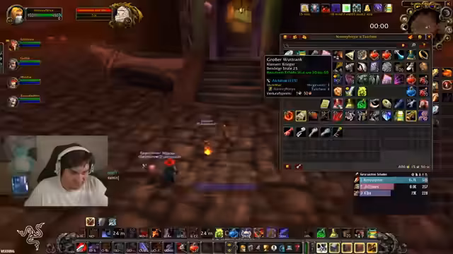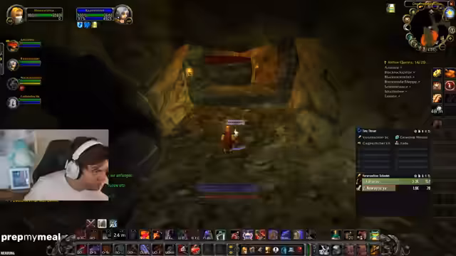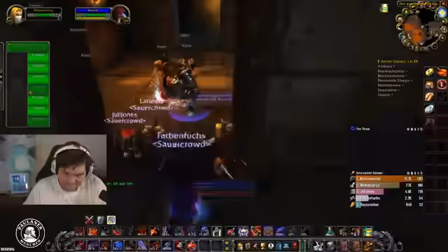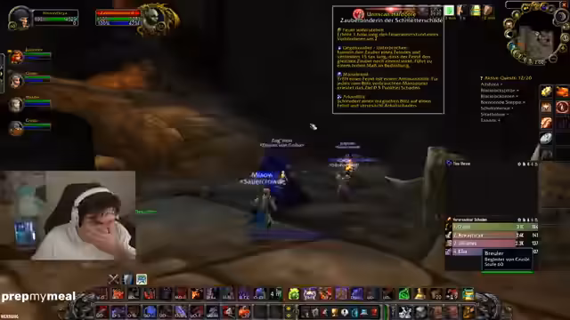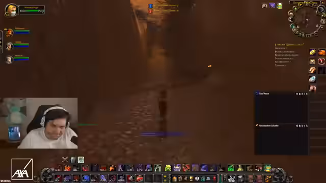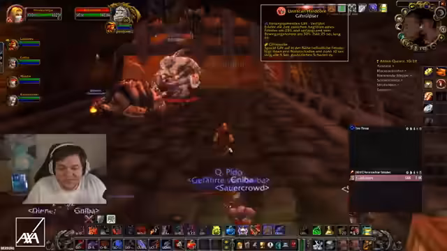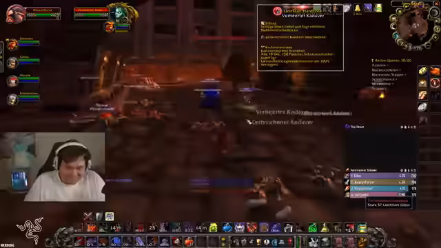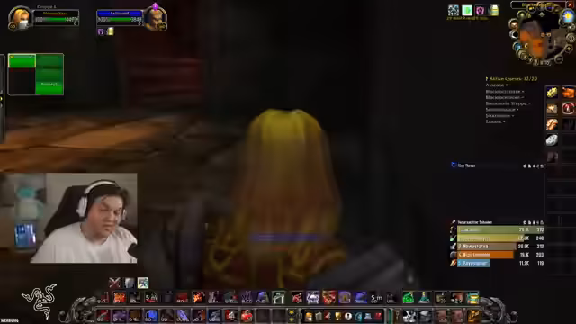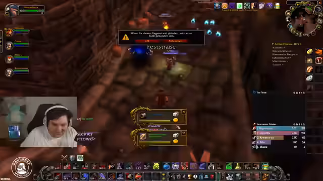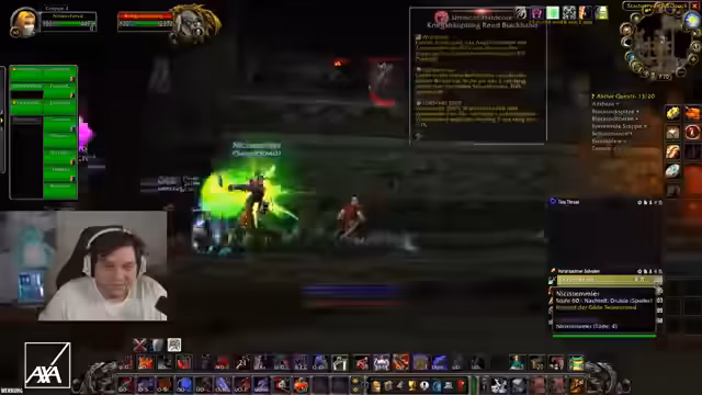 10:49:46Im Dungeon, speziell in Strat Living, wird die Kommunikation zur Herausforderung. Freddy muss sich auf ein bestimmtes Item konzentrieren, während andere Gruppenmitglieder andere Ziele verfolgen. Es kommt zu Missverständnissen über den nächsten Schritt, ob man erst weiter im Dungeon kämpft oder sich auf die Quest konzentrieren soll. Die Gefahr durch Adds wie das Auge von Naxxramas wird erwähnt. Die Anwesenheit eines Hexers zum Entfluchen ist entscheidend und wird genutzt. Das Zusammenspiel der Gruppe unter Stress wird getestet, als mehrere Gegner gleichzeitig auf die Gruppe losgehen.