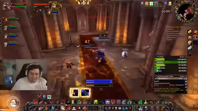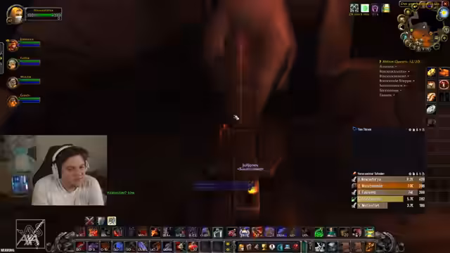 09:14:24Ein geplanter Bosskampf findet koordiniert statt. Die Gruppe platziert sich strategisch mit dem Rücken zur Wand, um dem Fall in die Lava zu entgehen. Die Taktik ist, die Ruferin zuerst zu fokussieren, während der Warrior den Tanking übernimmt. Der Streamer betont die Wichtigkeit einer entspannten Herangehensweise und lobt die saubere Ausführung des Kampfes als sehr geilen Zock.