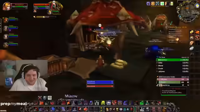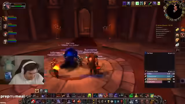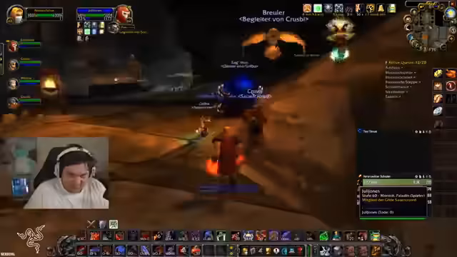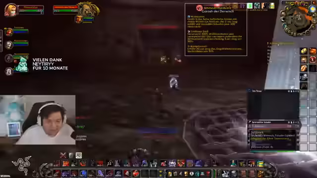10:55:51Die Gruppe befindet sich in der Endphase des Dungeon-Einsatzes. Die Behandlung von Gegnern wie dem 'Gaga' wird diskutiert; es wird empfohlen, sie zu pullen, wenn sie von einer bestimmten Seite kommen. Ein erfolgreicher Pull gelingt und die Gegner werden fokussiert. Die anfängliche Panik aufgrund von Silence-Effekten auf die Gruppe wird schnell bewältigt. Man öffnet eine Kiste, die man vorher nicht beachtet hatte. Der Fokus verschiebt sich wieder auf den Endboss, Baron Rivendare, und seine Ausrüstungsdrops, besonders einen mächtigen Umhang, der Freddy sehr wichtig ist.