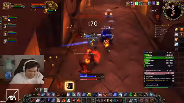 11:04:04Ein dynamischer Kampf gegen den Boss Beschwerer wird geführt, der mit massivem Area-of-Effect-Schaden und gezielten Fähigkeiten beantwortet wird. Der Streamer agiert als Tank und zieht die Mobs strategisch, um den Schaden auf die Gruppe zu verteilen und den Kampf zu kontrollieren, wobei ein gezielter Schlag auf die aggro-gebende Spielfigur erfolgte.