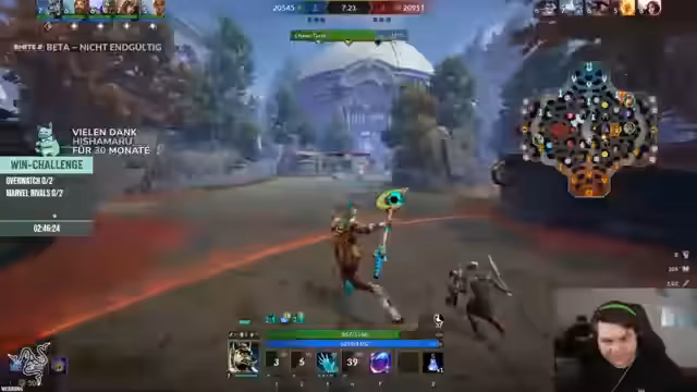 08:30:39Nach dem Abschluss des aktuellen Spiels gibt es eine Diskussion über die nächste Aktivität. Ein Spieler möchteMarvel Rivals spielen, ein anderes Teammitglied bevorzugt League of Legends wegen des Laufbands. Nach kurzer Überlegung wird sich fürMarvel Rivals entschieden. Es kommt jedoch zu technischen Problemen, die einen Neustart des Systems für League of Legends erfordern, was den Start verzögert. Ein Twitch-Benutzer namens Taz setzt den Streamer davon in Kenntnis und gibt ihm seinen alten Benutzernamen zurück, was als sehr nette Geste empfunden wird.