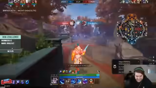 05:04:16Der Stream wechselt endgültig zu Overwatch. Das Team muss sich neu auf den Shooter-Typ einstellen und mit Champions wie Genji, Reinhardt und Zenyatta experimentieren. Es zeigt sich, dass die Positionen und Rollen, insbesondere für den Support, neu verteilt werden müssen. Das Gameplay ist anfangs holprig, mit unkoordinierten Bewegungen und Fehlern in der Team-Kommunikation, was zu einer ersten Niederlage führt.