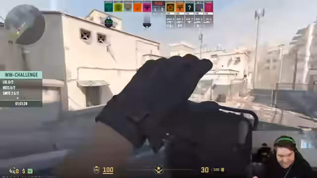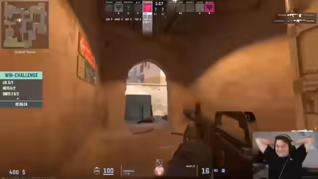 01:46:03Die Win Challenge beginnt mit CS2. Die Streamer spielen im Team, Metashi ist blau. Das erste Match läuft auf der Map Mirage. Beim Waffenskins wird viel über die Patterns gesprochen, Metashi hat einen 'Ludwim' auf seinem Messer. Die Runde endet mit einer humorvollen Androhung, wegen PUBG-Entzug direkt ins Gefängnis zu müssen. Das Gameplay wird mit intensiven Callouts und taktischen Entscheidungen geprägt, als sie eine A-Execute planen.