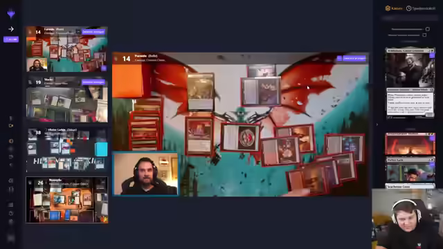 02:59:33Die Spieler diskutieren Strategien für ein Magic: The Gathering Commander-Spiel. Es wird erwähnt, dass der erste Mulligan in Commander kostenlos ist und der Commander als zusätzliche Möglichkeit für Card-Draw dienen kann. Die Spieler einigen sich darauf, dass es wichtig ist, sich gegebenenfalls gegen einen Spieler zu verbünden, der zu einer Bedrohung wird. Die Decks der anderen Spieler werden als unterschiedlich stark eingeschätzt. Es wird ein Fokus-Layout für den Stream eingerichtet, um das Spielgeschehen besser zu verfolgen. Die Spieler einigen sich auf ein Layout, bei dem der Spieler, der gerade am Zug ist, im Fokus steht, um das Board besser sichtbar zu machen. Die Mana-Quellen werden erklärt und die ersten Züge werden gemacht, wobei Länder und Zauber gespielt werden. Es wird ein Swamp gespielt, um Mana zu generieren. Der Chat wird über die Bedeutung von Ländern als Mana-Quellen aufgeklärt, die benötigt werden, um Kreaturen und Zauber zu wirken. Es werden Karten wie Path of Ancestry und Talisman of Indulgence gespielt, um Mana zu generieren und das Spiel voranzutreiben. Die Spieler tauschen sich über ihre Decks und Strategien aus, wobei der Fokus auf einem fairen und ausgewogenen Spiel liegt.