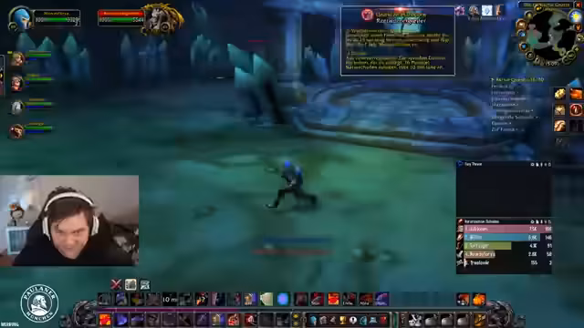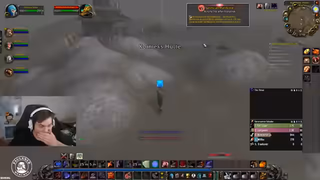 04:12:17Die Gruppe kämpft gegen den Prinzessinboss, bei dem ein Aggro-Ping-Pong stattfindet, da der Streamer Schwierigkeiten hat, die Aggro zu halten. Ein kritischer Fehler erfolgt, als ein Hunter versehentlich mit seinem Pet einen zusätzlichen Gegner anzieht, was zu einem gefährlichen Wipe führt. Die Gruppe kann sich mit dem Ruhestein und ins Wasser springen retten, wobei der Streamer Bubble einsetzt, um zu überleben.