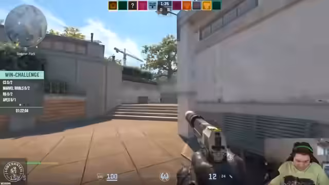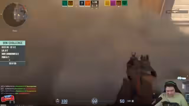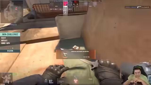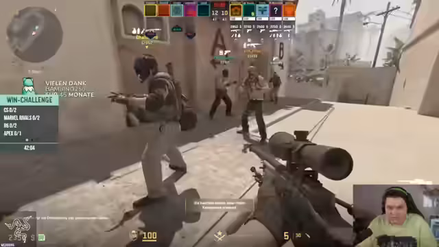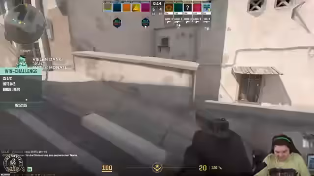 00:16:53Die Win-Challenge beginnt mit einem Runden von CS2 auf der Map Mirage. Die Streamer bilden ein Team und planen einen aggressiven Full-Buy, um die Gegner früh zu dominieren. Die Kommunikation im Team ist intensiv, mit Fokus auf das Halten der Positionen A und B. Es kommt zu hektischen Feuergefechten und taktischen Entscheidungen, wie das Nutzen von Smokes und Flashs. Das erste Spiel endet trotz guter Bemühungen mit einer Niederlage, was aber als Teil des Challenges akzeptiert wird.