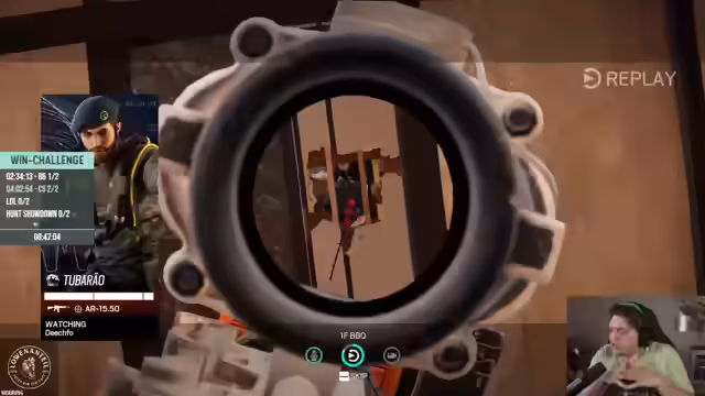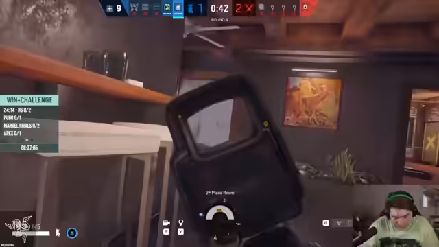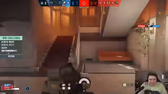 06:55:04Ein Angreifer nutzt Seile, um sich über den Kopf eines Verteidigers an einem Fenster abzuseilen. Der Streamer erkennt, dass er im entscheidenden Moment, nachdem er das Seilgeräusch hört, um die Ecke gehen und den Gegner töten kann. Doch dieser schießt durch eine Rauchgranate und gelangt so in das Gebäude. Die Situation führt zu einem Knockout für das Team, wobei ein Spieler als Pick-Pinyata fungierte, um einen Gegner abzulenken, was jedoch scheitert.