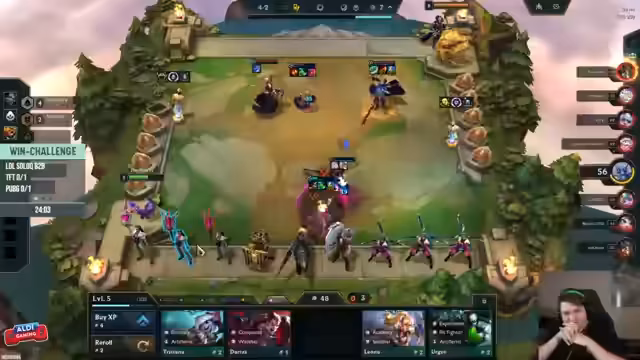 02:37:47Die Win-Challenge beginnt mit einem Spiel von Teamfight Tactics (TFT). Der Streamer spielt mit dem Comp Renata-Reroll und diskutiert über Stärken und Schwächen der Champions wie Tristana und Urgot sowie über Items wie Nashor's Zahn. Die Diskussion ist von hohem Eingriffsgrad durch den Chat geprägt, der ständig Vorschläge für Builds und Strategien gibt. Gleichzeitig reflektiert der Streamer über die Schwierigkeiten, Solo-Q im Nachtschritt zu spielen und den Einfluss auf die Lebensqualität und das soziale Umfeld.